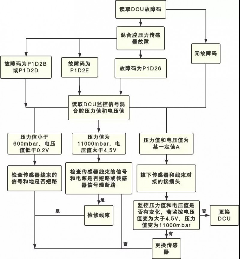 信号监控压力值为0-0.6Bar或11bar或某一不变固定值A,混合腔压力传感器失效,致使尿素泵不工作。